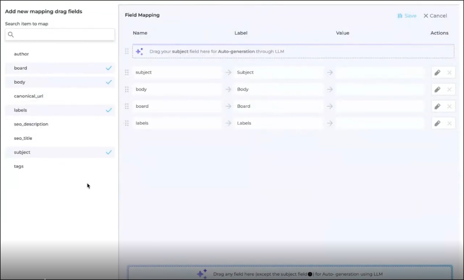 To autogenerate a knowledge article description, map the body or description field to "Drag any field here (except the title field) for Auto- generation using LLM".