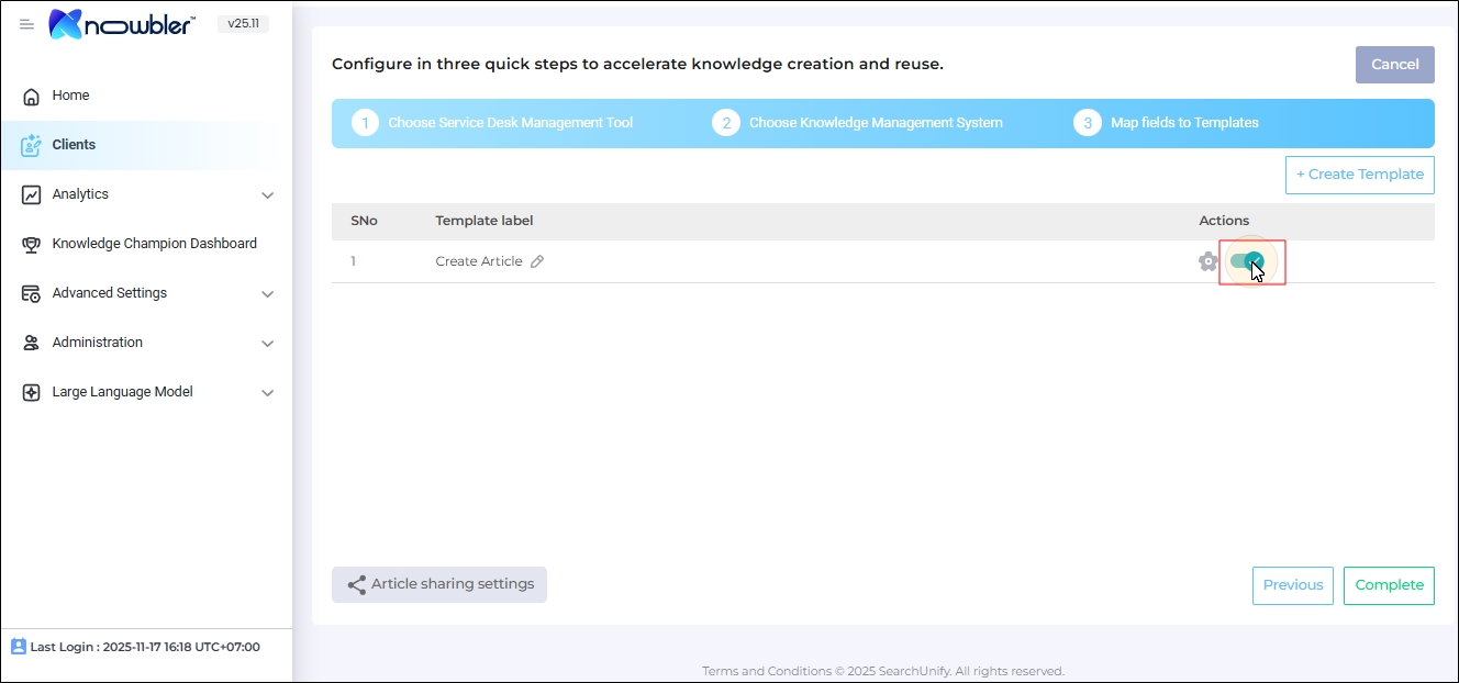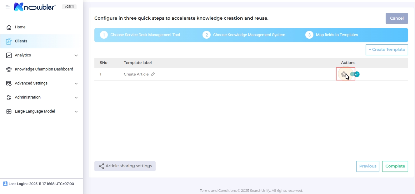 The article templates in Khoros are reflected on the Map Fields screen. If you have added or deleted a template in Khoros, click Refresh Template List to view the latest list. The button refreshes the templates list. You can map fields in all the templates, or in only a few of them. To deactivate a template, use the toggle in the Actions column.